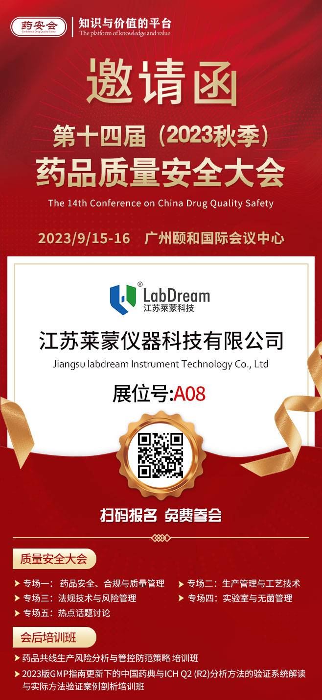 江蘇萊蒙誠邀您參加 第十四屆 (2023秋季) 藥品質(zhì)量安全大會(huì) LABDREAM 聽行業(yè)大咖探討藥品安全,合規(guī)管理,生產(chǎn)及工藝技術(shù),實(shí)驗(yàn)室及無菌管理,法規(guī)更新,風(fēng)險(xiǎn)管理等熱門干貨話題! 萊蒙科技(A08)將首次攜最新流動(dòng)相自動(dòng)化產(chǎn)品樣機(jī)亮相展會(huì),屆時(shí)更有豐富禮品贈(zèng)送,歡迎各位老師蒞臨參觀!